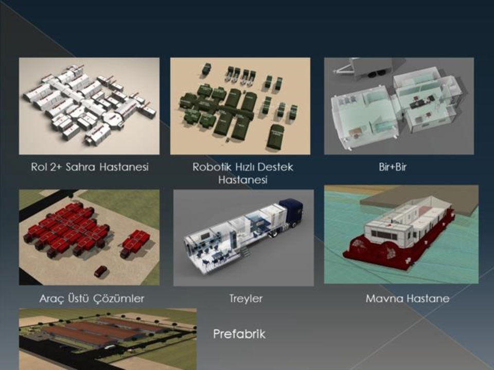 Tüm sistemleri oluşturan temel yapıtaşları ; otomatik genişleyebilen ve kendi kendine araca yüklenip/inebilen, İSO standardlarında ürettiğimiz 100% Türk mühendisliği robotik konteynırlarımız, şişebilen çadırlar, treyler ve prefabrik parçalardır